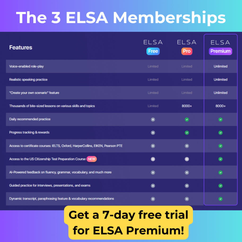 You can try out ELSA Pro and ELSA Premium on a 7-day free trial. If you would like to upgrade permanently, use my special links to get a great discount.